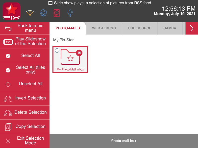 Here you can browse through all the folders and files you’ve previously copied or sent to your frame. Find the video file you want to play, select it, and click on the “Play slideshow of the Selection” to view the video file/files.