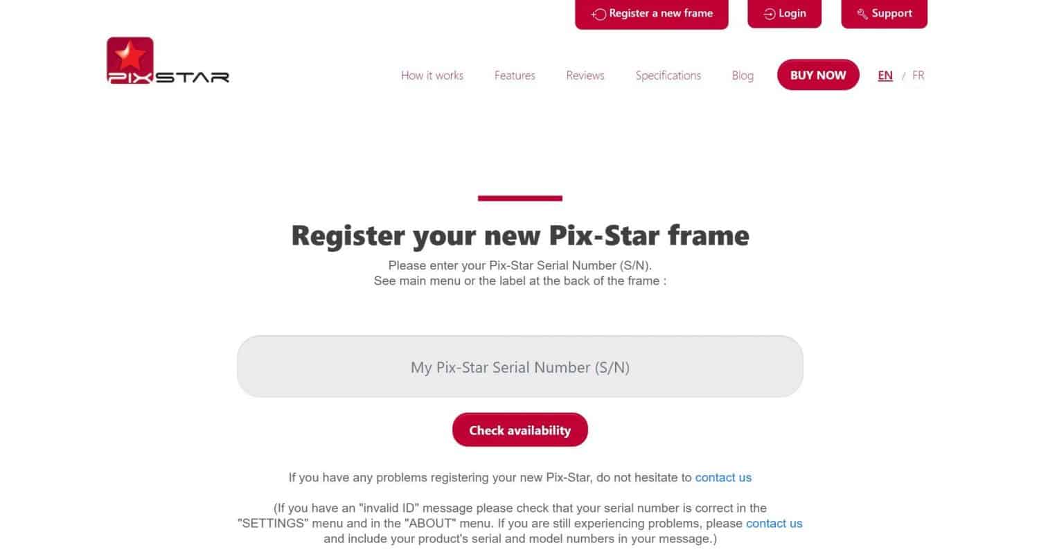 Now that you’re connected to Wi-Fi, head over to pix-star.com on a PC. Click on “Register a new frame” at the top of the screen. Here you will be asked to input the serial number of your Pix-Star frame.
