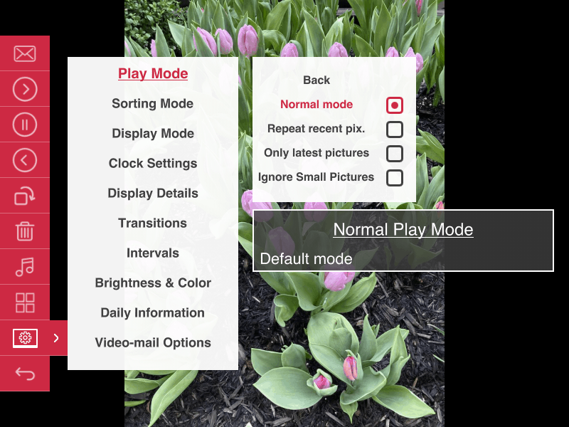 One great feature of Pix-Star frames is their ability to adjust slideshow settings without needing to leave the slideshow. While you’re in a slideshow, press the “Menu” button on the remote control (three horizontal lines with bullet points on the left). Here you have various options like rotating photos, deleting a photo, playing a song over the slideshow, etc.