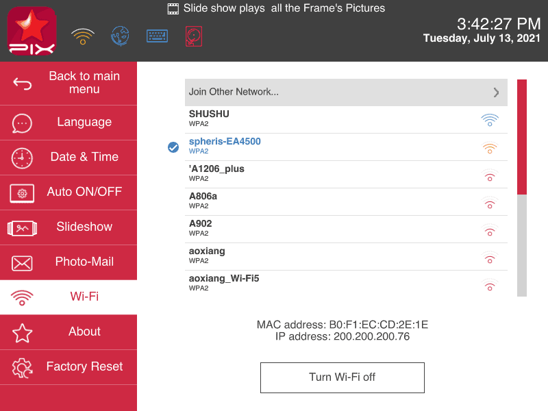 If your Pix-Star frame has already been set up you need to connect to Wi-Fi by going to the settings menu. Simply navigate to the “Settings” tab from the home screen and press “ok”. Here, use the arrow buttons to scroll down to the “WiFi” tab (3rd from the bottom) and press “ok”. Select your home Wi-Fi network from the list and press “ok”. Input your Wi-Fi password using the on-screen keyboard and select “Enter” when you’re ready. Click “Join” to connect. It might take a couple of seconds to process and save the connection.