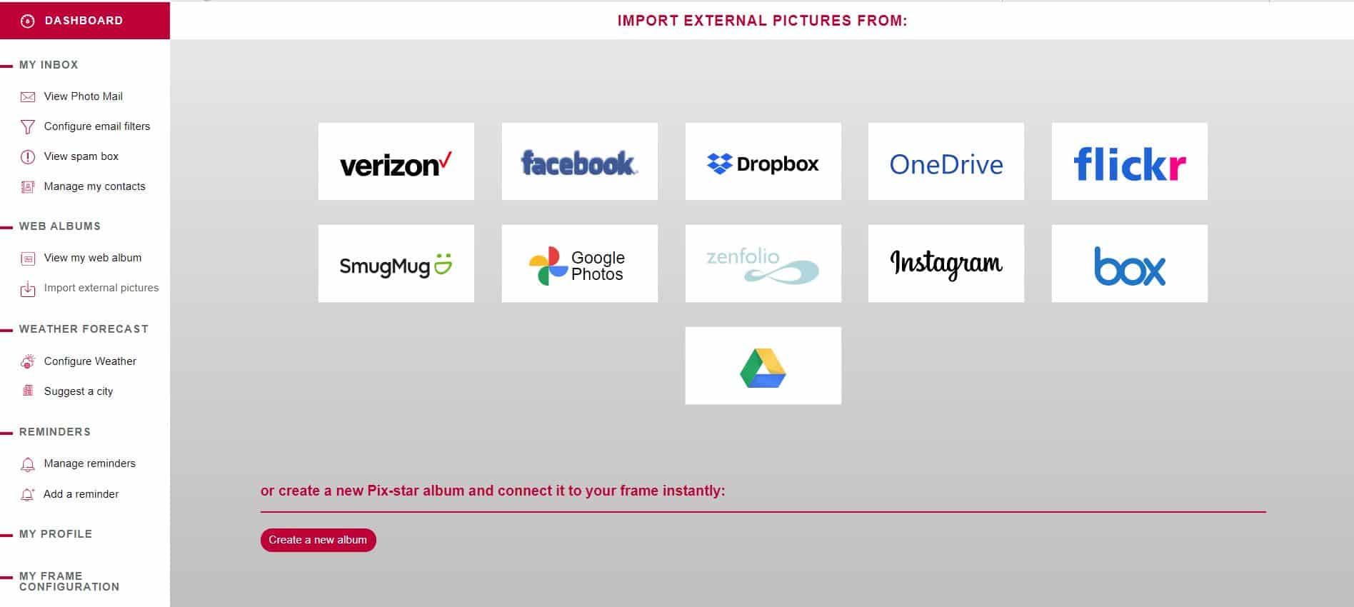 An important part of learning how to use the Pix-Star web dashboard is its web album support. It’s a unique feature that Pix-star arguably does the best. “Web albums” is the name for photo albums that are saved on social media, photo-sharing, and online storage platforms. Pix-Star supports almost a dozen platforms including Facebook, Google Photos, Instagram, Flickr, Google Drive, Dropbox, and more.