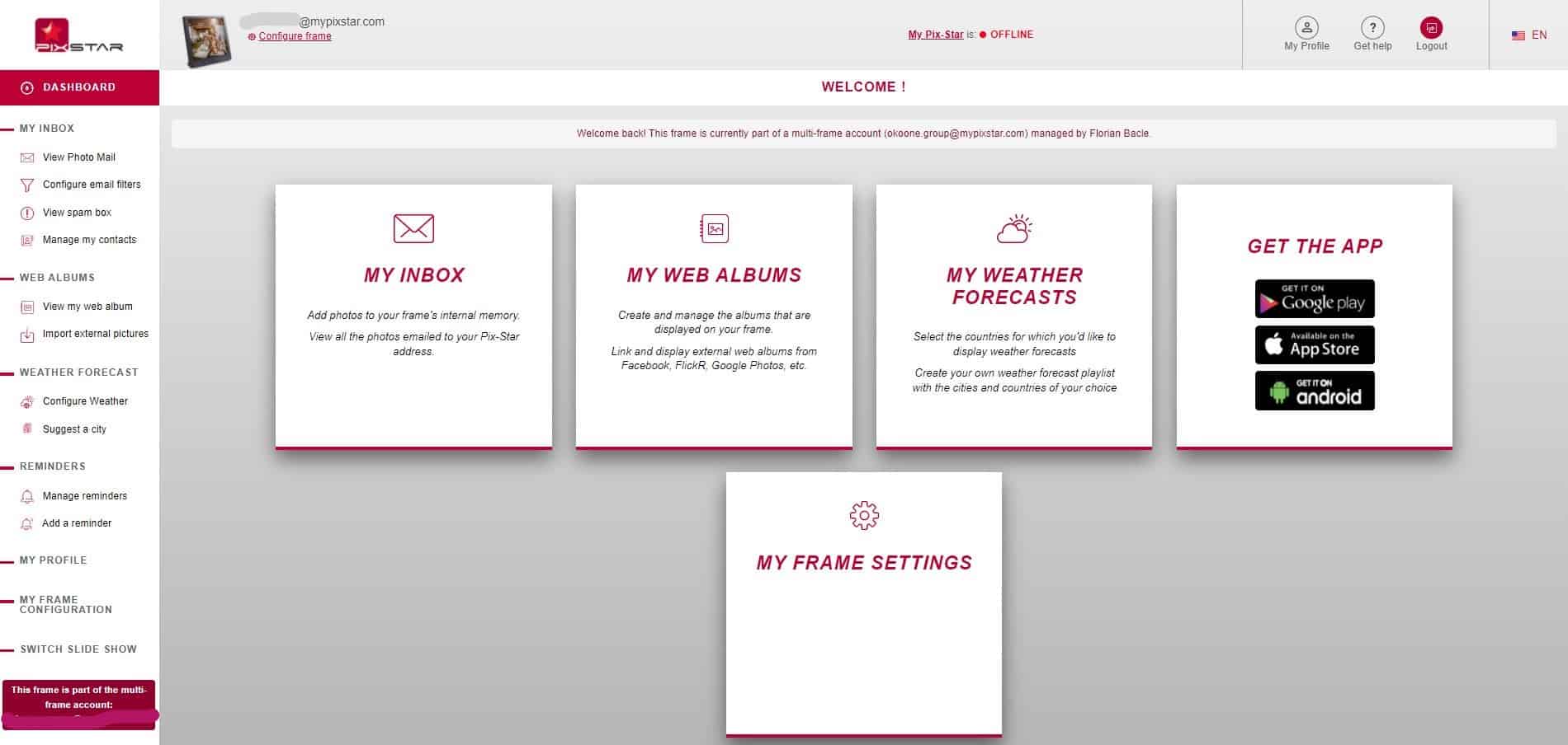 When you arrive at your frame’s web dashboard, take a couple of minutes to get familiar with the layout of the options, controls, and settings. Head over to the “My profile” section at the top right corner of the screen and make sure all your information is correct.